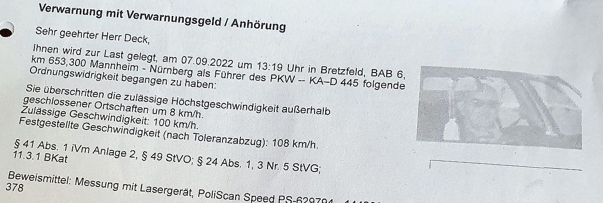 Mit 108 km/h statt 100 km/h auf der Autobahn gefahren. Wir waren auf dem Weg nach Passau, zu unserer Tour „Donauimpressionen mit Rad & Schiff“.