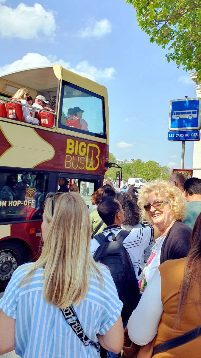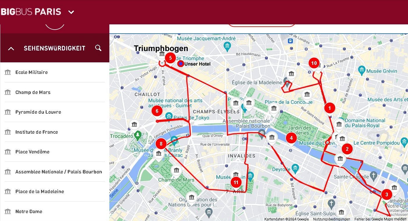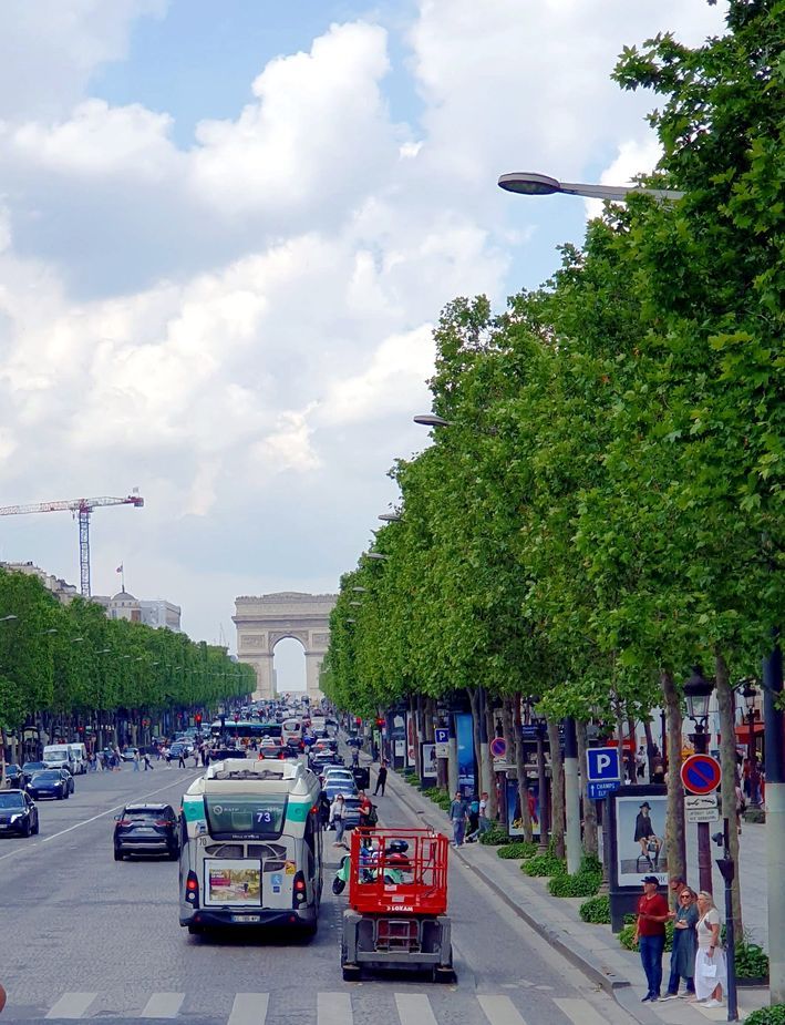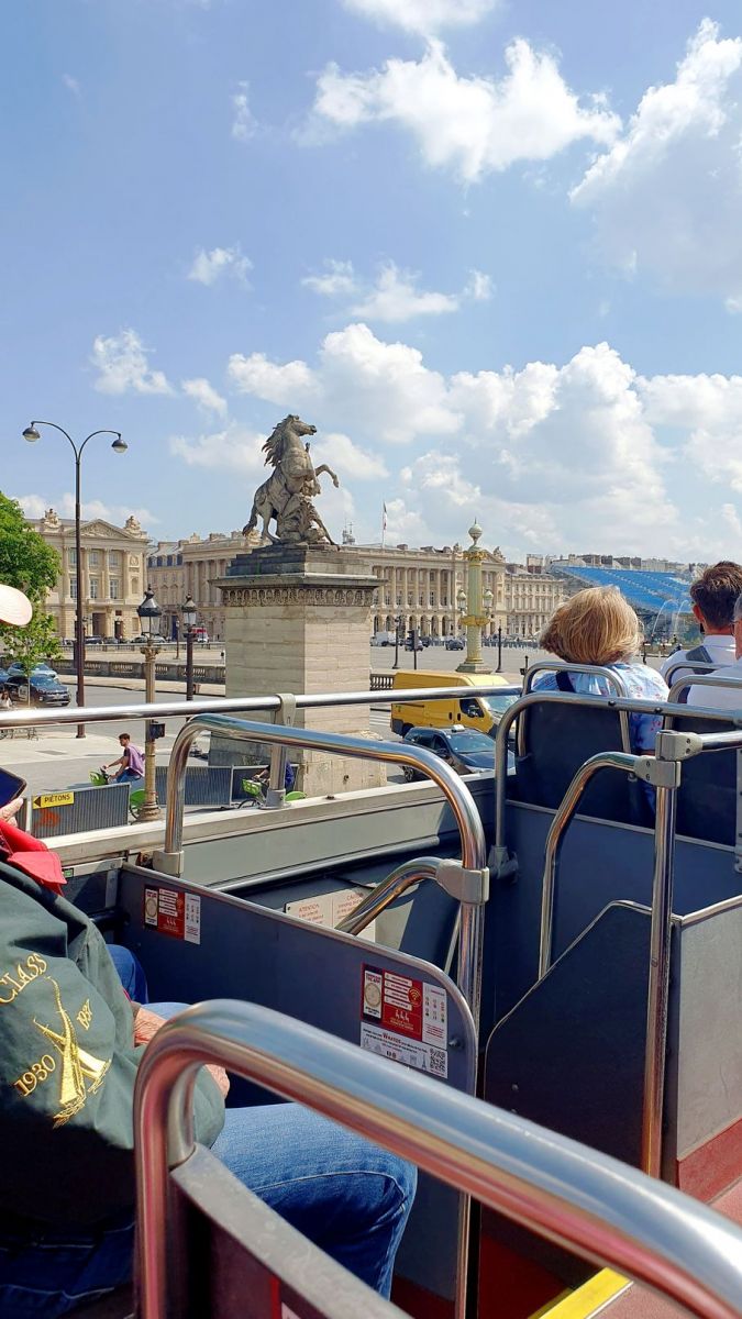 Der Tag begann mit einem sonnigen Frühstück in Sichtweite des Arc de Triomphe, in unserem Lieblingsrestaurant, dem Café George V auf den Champs Élysées. Unweit davon, direkt am Triumphbogen, ist eine Haltestelle der roten Doppeldeckerbusse für die Stadtrundfahrt. So beschlossen wir spontan, eine Runde, ohne auszusteigen, durch Paris mit dem Doppeldeckerbus zu fahren.