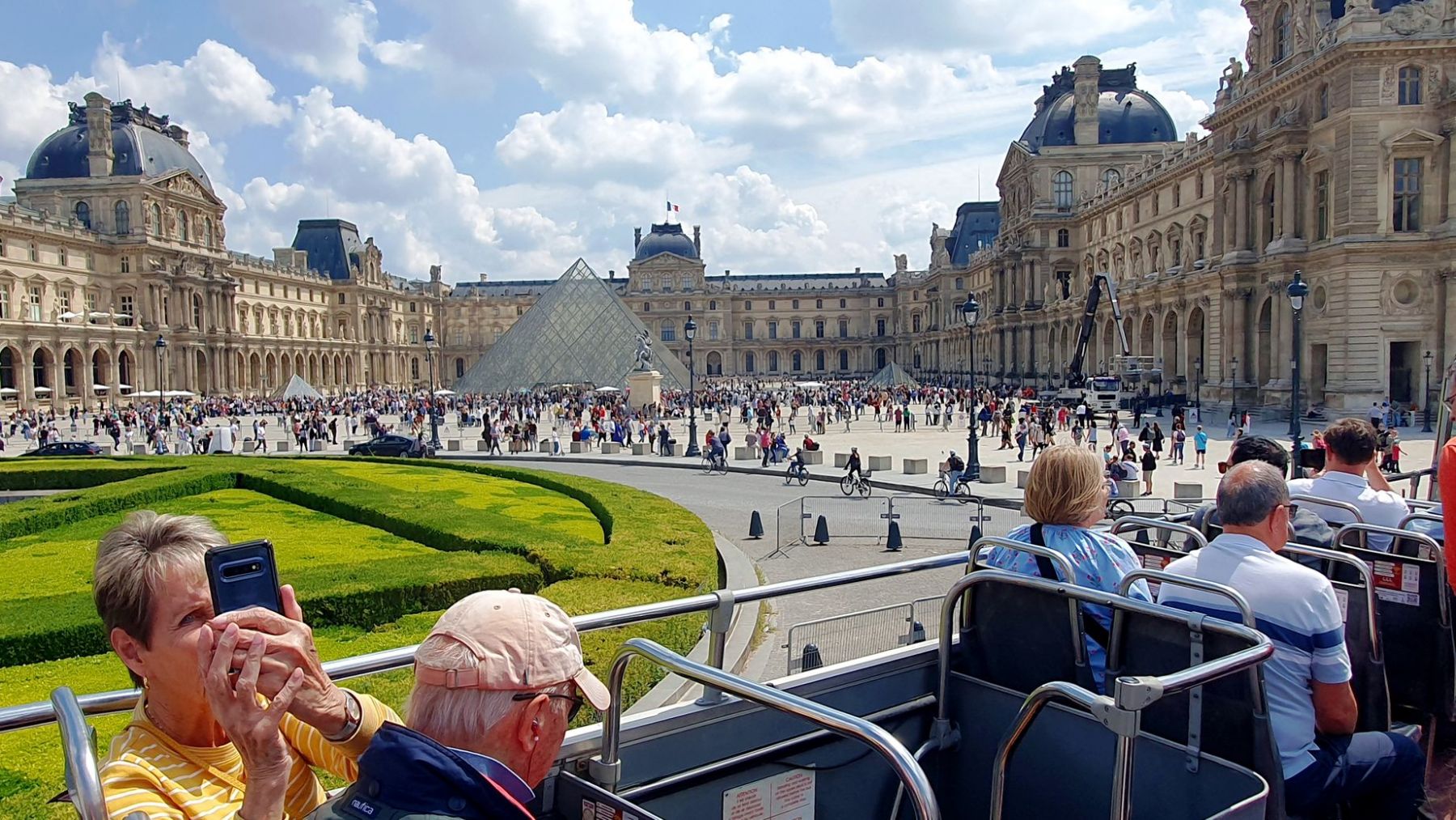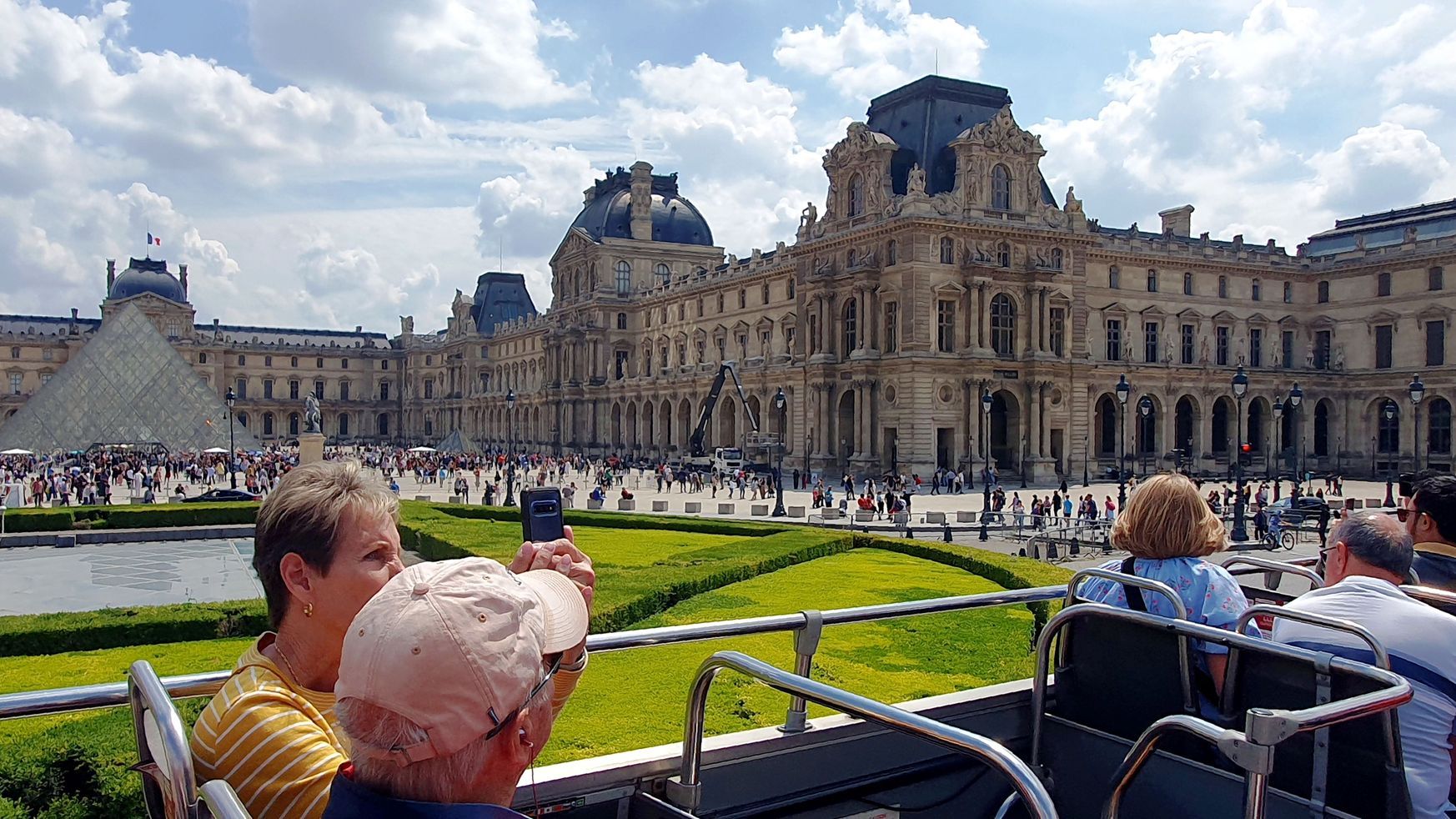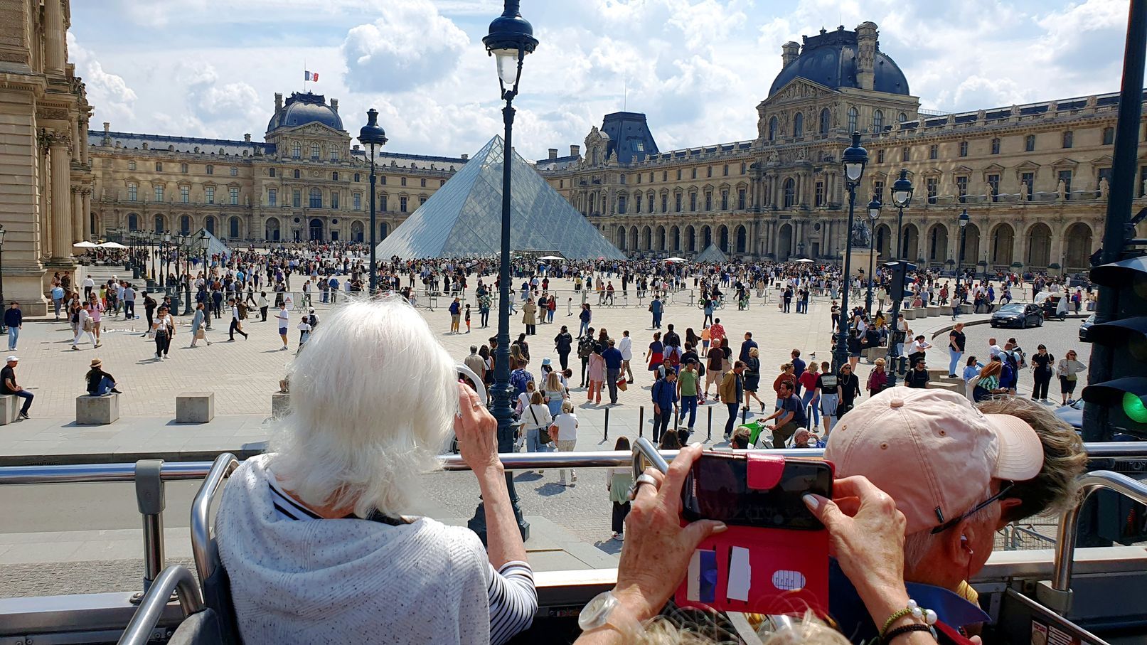 Der Tag begann mit einem sonnigen Frühstück in Sichtweite des Arc de Triomphe, in unserem Lieblingsrestaurant, dem Café George V auf den Champs Élysées. Unweit davon, direkt am Triumphbogen, ist eine Haltestelle der roten Doppeldeckerbusse für die Stadtrundfahrt. So beschlossen wir spontan, eine Runde, ohne auszusteigen, durch Paris mit dem Doppeldeckerbus zu fahren.