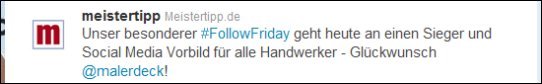 Im Februar 2010 begann ich mit zwei Konten, mit meinen Unternehmen „malerdeck“ und „Opti-Maler-Partner“, meine Twitter-Karriere. 😉 Es folgten mit „Maler-Franchise“ (06/2011) und „Mister-Social-Media“ (07/2012) noch zwei weitere Konten.