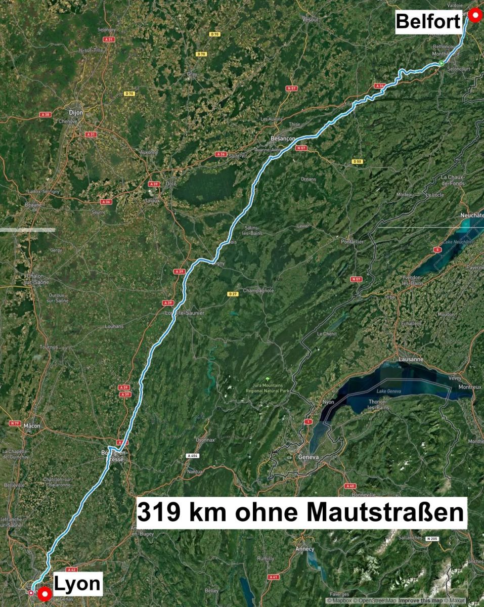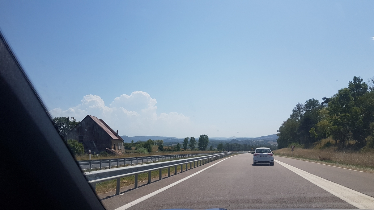 Freitag, 15. August 2025. Flussreise Lyon Mittelmeer Etappe 2. Der Tag heute begann, wie der gestrige endete: heiß! Darum ließen wir es auch gemächlich angehen. Unsere Siebensachen gemütlich einpacken, Kleinigkeit Frühstücken und um ca. 10:45 Uhr saßen wir im offenen Auto und starteten gen Lyon. Zur Fahrstrecke von Belfort nach Lyon gibt es diese besondere Geschichte.