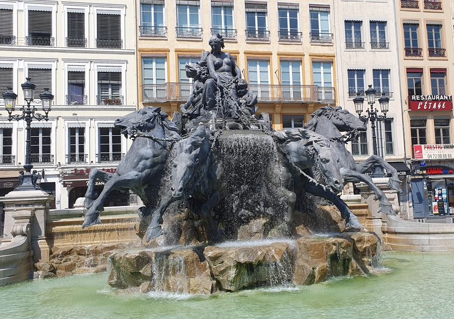 Im Zentrum steht die Fontaine Bartholdi, geschaffen von Frédéric Auguste Bartholdi, dem Schöpfer der Freiheitsstatue. Ursprünglich für Bordeaux entworfen, wurde sie 1890 von Lyon erworben und 1892 aufgestellt. Die Skulptur zeigt eine weibliche Allegorie auf einem Triumphwagen, gezogen von vier Pferden, die Frankreich und seine großen Flüsse symbolisieren. 1994 wurde der Platz neu gestaltet, wobei der Brunnen näher an das Museum der Schönen Künste versetzt wurde. Bereits 1895 als „Monument historique“ eingestuft, wurde die Fontaine zwischen 2016 und 2018 umfassend restauriert und erstrahlt seitdem wieder in voller Pracht.