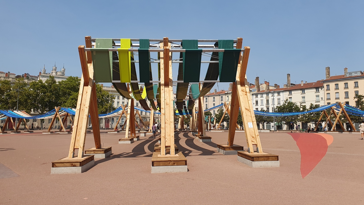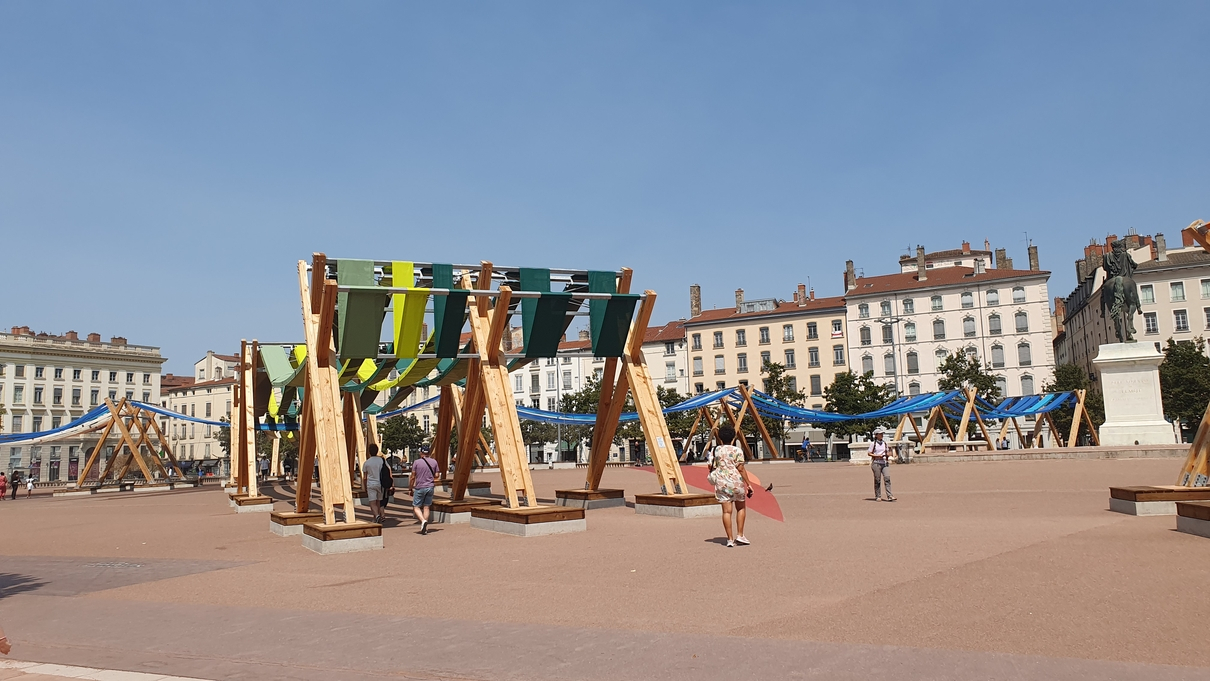 Auf dem Place Bellecour steht seit Frühjahr 2025 auch die Kunstinstallation „Tissage Urbain“ von Romain Froquet und Tristan Israel. Die Installation besteht aus großen Holzbögen mit farbigen Stoffbahnen, die an die Seidenweber-Tradition der Stadt erinnern. Sie spenden Schatten, sorgen mit feinen Nebeldüsen und Beleuchtung für angenehme Aufenthaltsbereiche und verbinden Kunst, Nachhaltigkeit und Stadtraumgestaltung. Das fünf Jahre angelegte Projekt kostet rund 1,5 Millionen Euro und wird teils begeistert aufgenommen, teils wegen der Kosten kontrovers diskutiert.