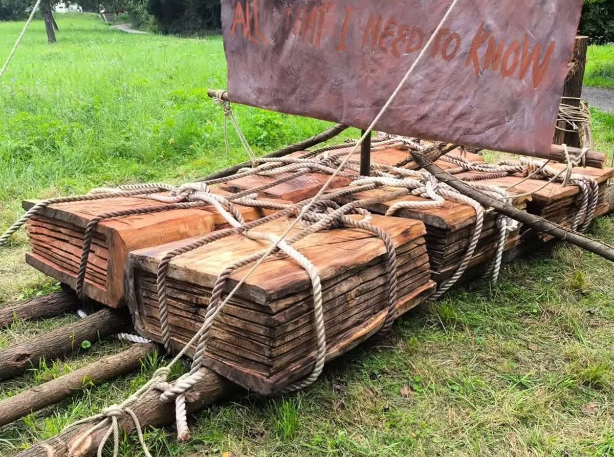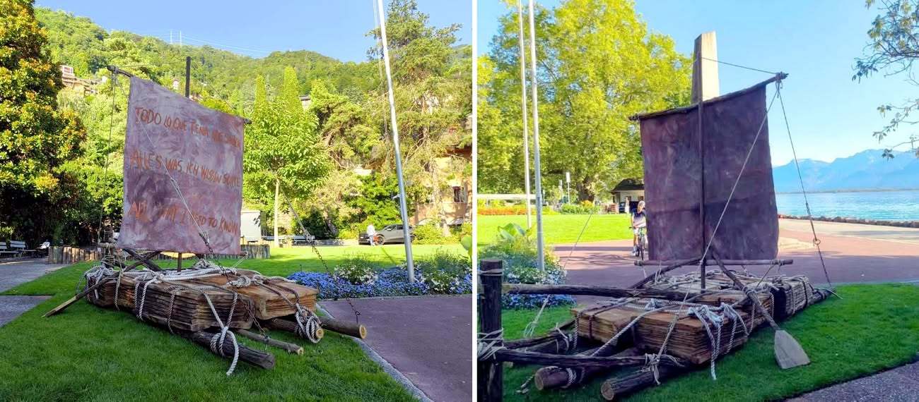 Das Werk zeigt ein Floß aus Ästen, auf dem sechs übergroße Bücher aus Holz ruhen, jedes einzelne rund 200 Kilogramm schwer. Pavel hat dieses außergewöhnliche Objekt in monatelanger Arbeit in seinem Atelier in Berghausen bei Karlsruhe geschaffen und gemeinsam mit Freunden an den Genfersee gebracht.