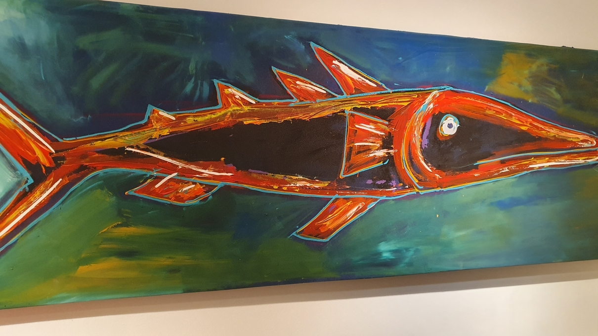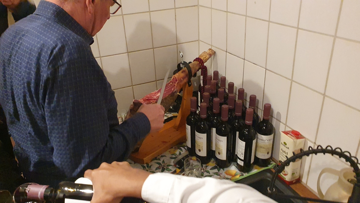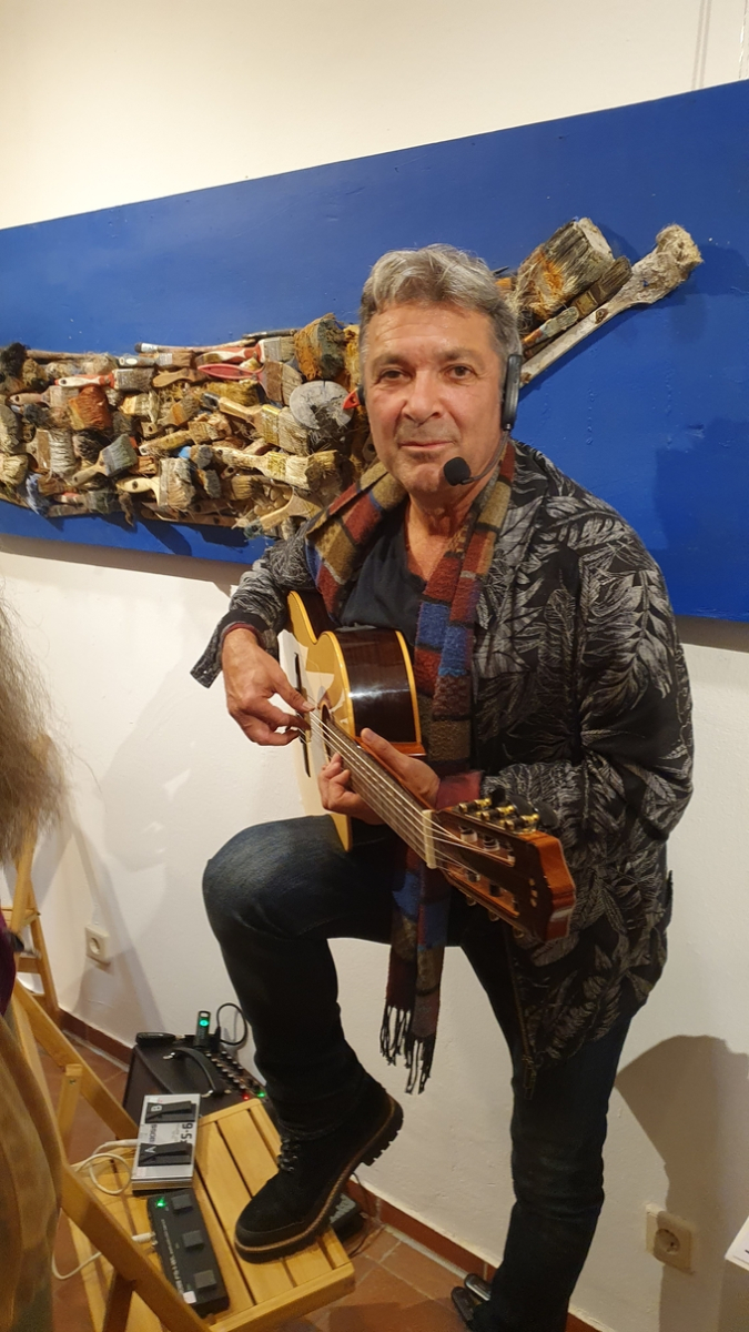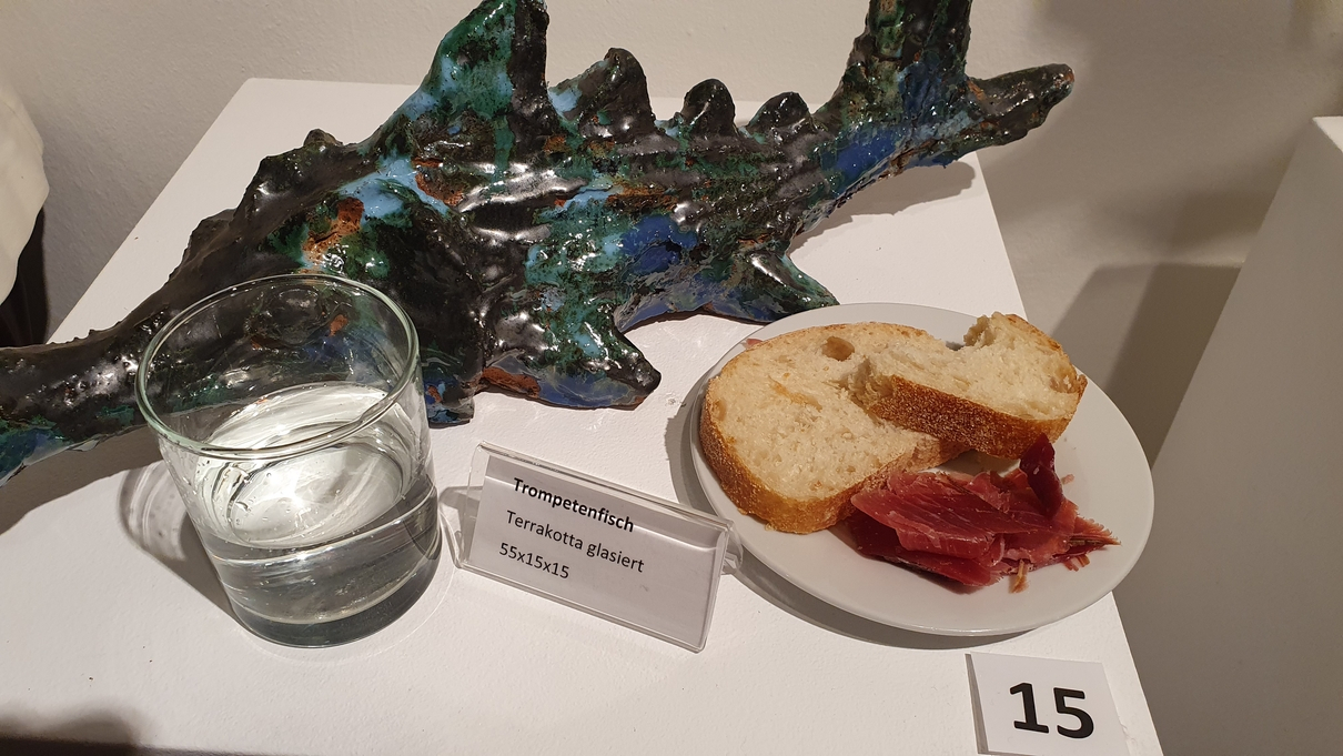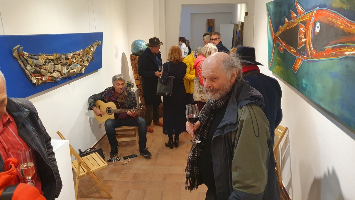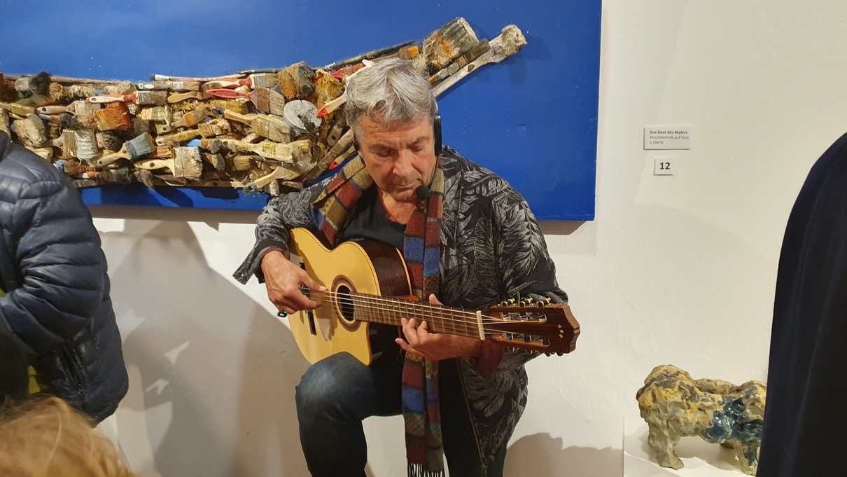 Der Abend wurde dezent untermalt mit spanischer Gitarrenmusik von Richy Ricardo. Die warmen Klänge seiner Gitarre harmonierten perfekt mit der sinnlichen Tiefe von Pavels Werken. Bei Serrano-Schinken, Weißbrot und einem Glas Wein kamen Gäste und Künstler miteinander ins Gespräch, lachten, philosophierten, genossen. Für den ersten roten Punkt des Abends sorgte Marina Käuflein, die gleich zwei Objekte erwarb – und andere ermunterte, es ihr gleichzutun.