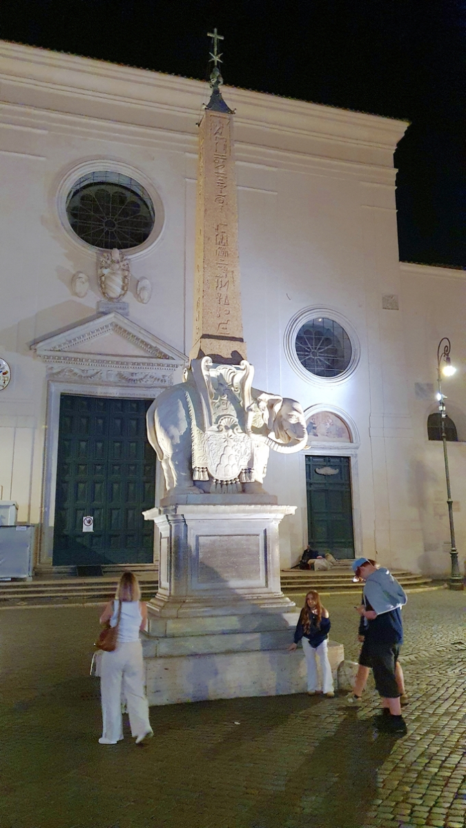 Unser Heimweg führte uns über die Piazza della Minerva. Vor der Kirche Santa Maria sopra Minerva steht ein ägyptischer Obelisk auf einem kleinen Elefanten – der berühmte „Pulcino della Minerva“. Der Obelisk stammt aus dem 6. Jahrhundert v. Chr. und wurde im Tempel der Isis entdeckt. Papst Alexander VII. ließ ihn 1667 an diesem Platz aufstellen. Der Elefant symbolisiert Weisheit und Stärke – Tugenden, die die Last des Wissens tragen – ein wunderschönes Sinnbild barocker Gedankenwelt.